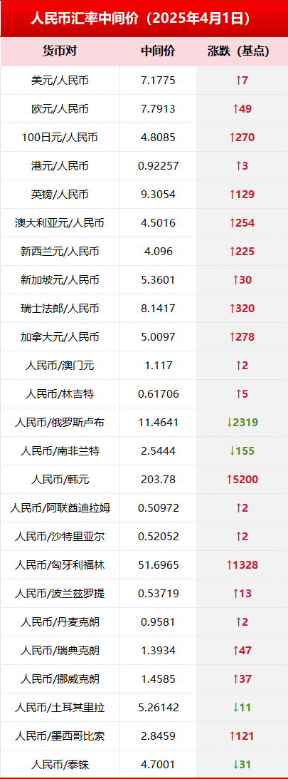 2025年4月1日,中国人民银行授权中国外汇交易中心公布银行间外汇市场人民币汇率中间价。具体如下: