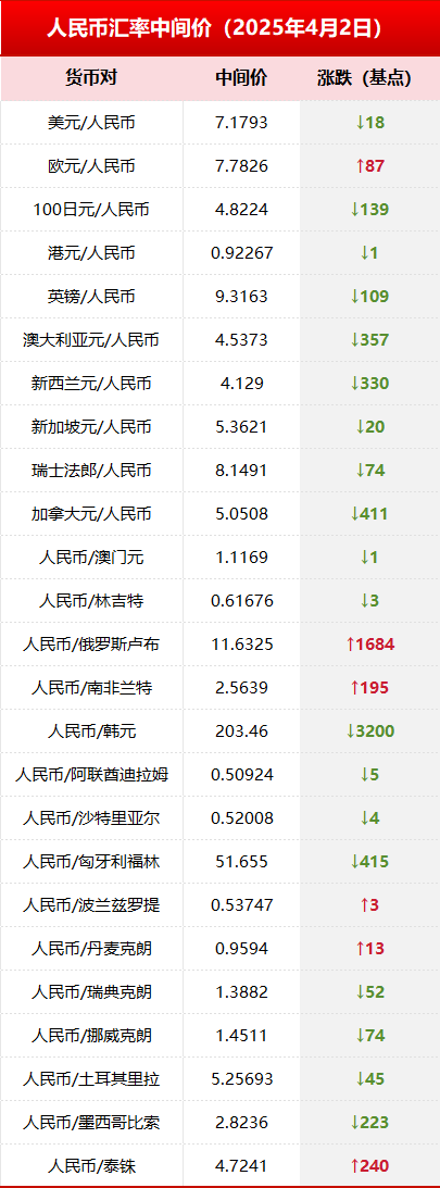 2025年4月2日,中国人民银行授权中国外汇交易中心公布银行间外汇市场人民币汇率中间价。具体如下: