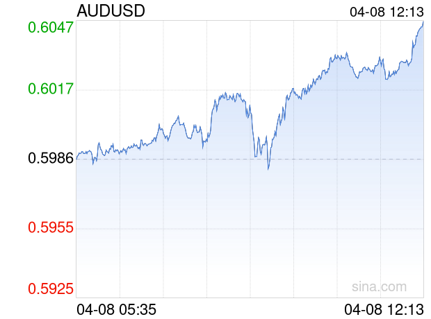 新浪外汇消息2025年04月08日,截至12时13分,外汇市场上澳元兑美元汇率突破1澳元兑换0.6048美元。涨幅为1.0273%