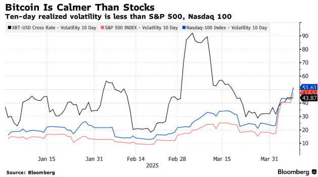 在过去10个交易日中,比特币的实际波动率指数为43.86,低于标普500指数的47.29和纳斯达克100指数的51.26。换言之,美股行情眼下已比长期以高波动的比特币更为跌宕。