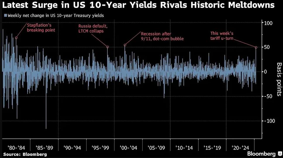 行情数据显示,截止本周五收盘,素有“全球资产定价之锚”之称10年期美债收益率已创下了逾20年来的最大单周涨幅(收益率与债券价格反向),因投资者持续撤出美国资产。