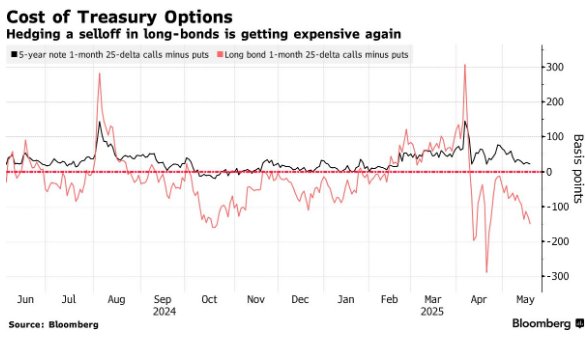 由于对美国政府不断膨胀的债务和赤字的担忧,交易员纷纷押注长期美债收益率将飙升,而总统唐纳德·特朗普的减税法案更是让这一局面变得岌岌可危。黯淡的经济前景刺激了美债期权的对冲活动,投资者试图在年底前提高长期债券的收益率。最新一轮的下行押注与华尔街的情绪相呼应,高盛、摩根大通等大行的策略师们纷纷上调对收益率的预测。