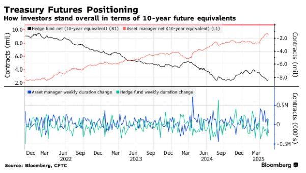 CFTC数据显示,在截至5月13日的一周内,资产管理公司大量平仓多头头寸,对冲基金则回补空头头寸,出现大量去杠杆操作。资产管理公司平仓的净多头久期规模大致相当于21.7万份10年期国债期货合约,而对冲基金回补空头的净久期规模约为13.9万份10年期国债期货合约。资产管理公司平仓的净多头规模为去年11月以来最大。