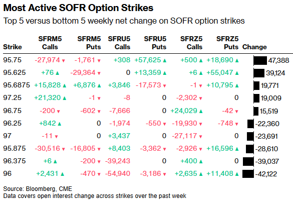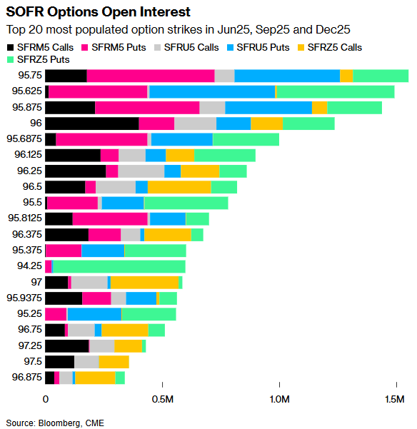 95.75行权价在2025年6月、9月和12月期权中仍是持仓量最高的点位,这主要是因为通过各种2025年9月到期的看跌期权结构对该点位存在大量需求。95.625行权价的持仓量也依然较高,这是由于通过SFRM5 95.75/95.625看跌期权价差,围绕2025年6月到期的看跌期权出现了大规模持仓,该价差近期有交易发生。持仓量最高的三个行权价中,仍包含大量2025年6月到期的看跌期权风险敞口。