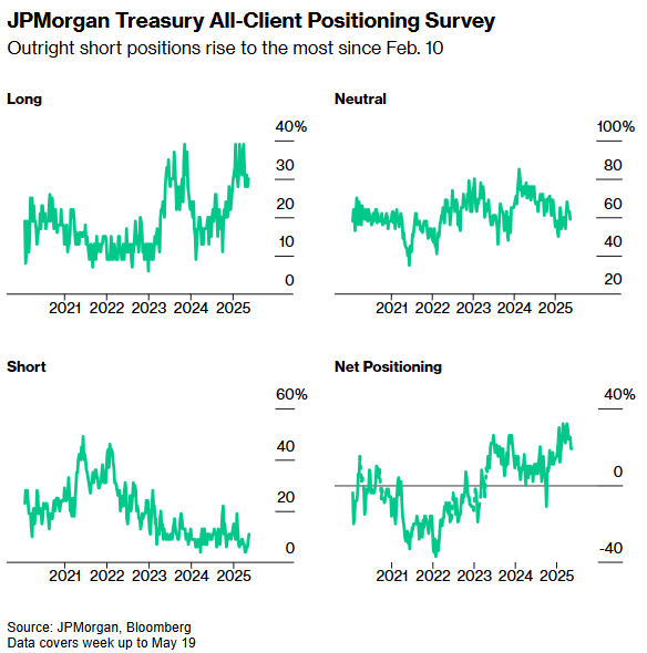 摩根大通周二的美债客户调查也凸显了对债券收益率上升的预期,直接空头头寸攀升至2月10日以来的最高水平。不过,由于投资者的持仓状况比4月初更为中性,策略师们预计“波动幅度将远小于上月”。