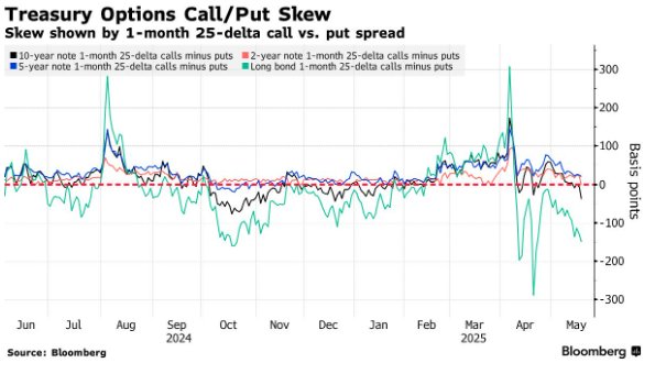 目前,针对美债收益率曲线长端更大损失的对冲溢价已升至4月以来的最高水平,当时市场因特朗普激进的贸易政策可能带来的经济影响而受到冲击。当前期权偏度的变化意味着,相对于从收益率下跌中获利的看涨期权,交易员正在推高用于对冲收益率飙升风险的看跌期权的价格。