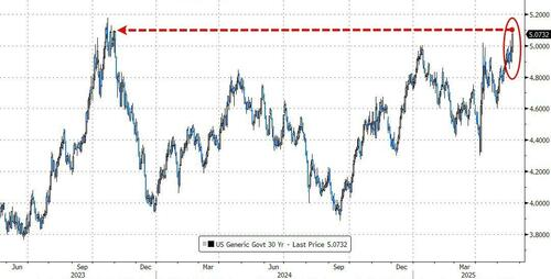 债券市场正对预算法案“投下自己的一票”,周三,美国30年期国债收益率一度飙升至5.1%,逼近二十年来的高点,10年期美债收益率也升至4.595%,股市也遭拖累大跌,投资者再次涌向黄金和比特币等避险资产。