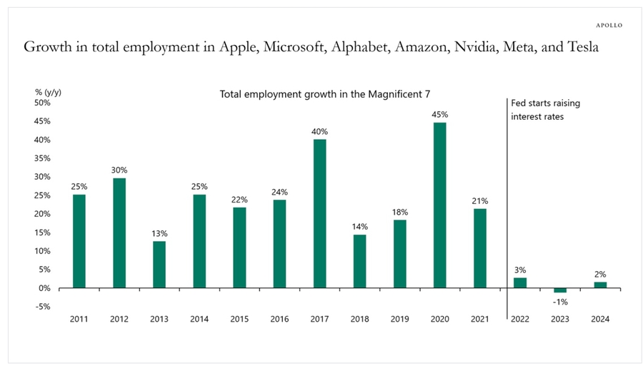 Stock指出,“美联储自2022年3月启动加息周期后,‘七巨头’(苹果(AAPL.US)、亚马逊(AMZN.US)、谷歌(GOOGL.US)、Meta(META.US)、微软(MSFT.US)、英伟达(NVDA.US)、特斯拉(TSLA.US))便停止了大规模招聘新员工的步伐”。
