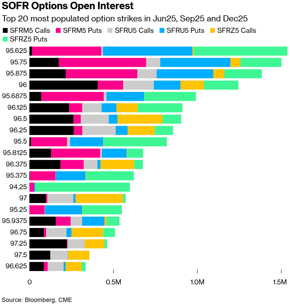 尽管过去一周出现了大量清算,但95.75的执行价格仍然是第二大执行价格。目前,95.625的执行价格在6月25日、9月25日和12月25日的期权期限中占据了最大执行价格,这主要是因为通过SFRM5 95.75/95.625看跌期权价差,围绕6月25日看跌期权持有大量仓位,该价差最近已成交。执行价格最高的前三个期权期限中仍然包含大量2025年6月看跌期权敞口。