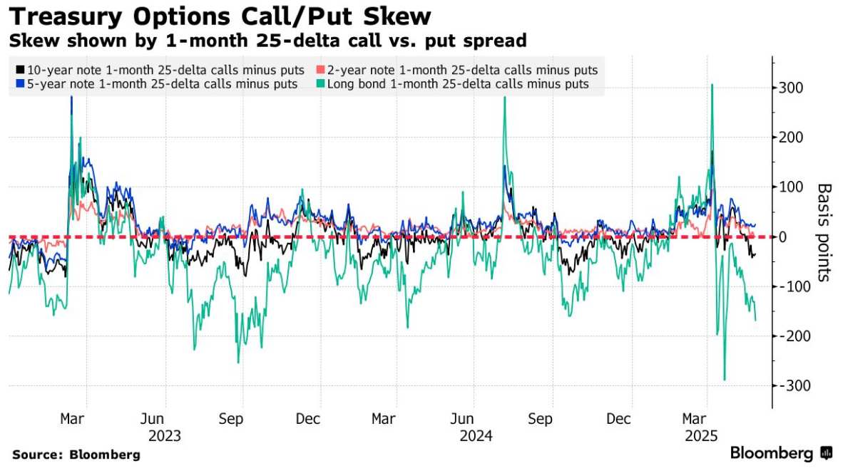 周二,随着全球债券市场反弹,基准收益率大幅下跌,长期债券获得了一些喘息机会。然而,30年期收益率仍徘徊在5%左右,表明投资者情绪依然反复无常。这种不确定性也体现在期权市场上,交易员正支付更高的溢价来对冲长期国债期货的进一步抛售,而非押注反弹。