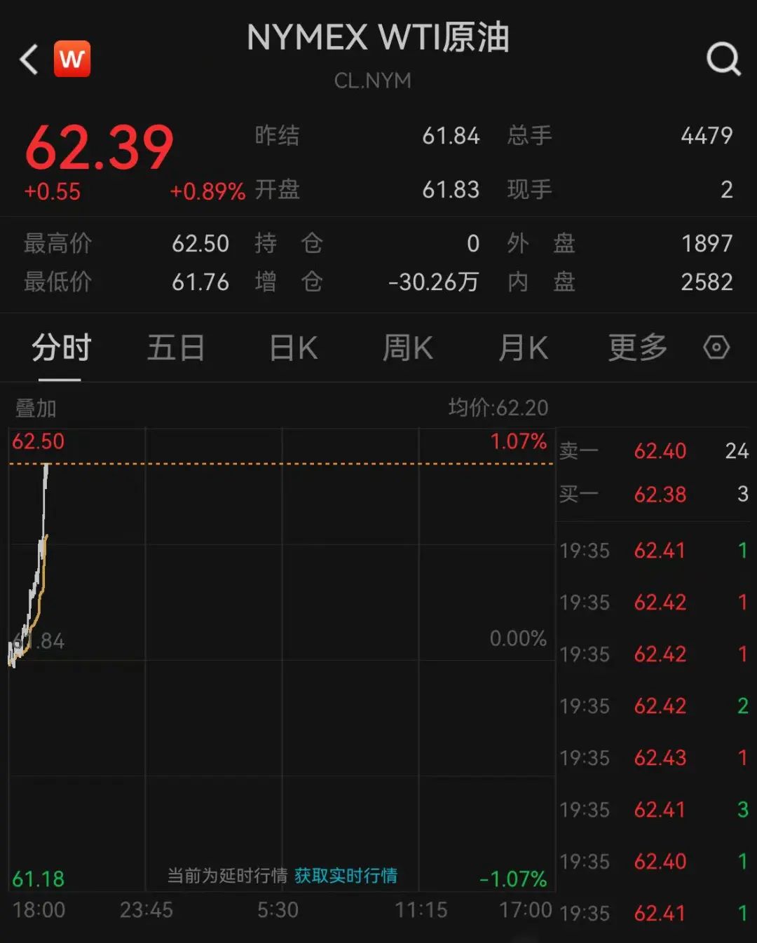 WTI原油涨0.89%,报62.39美元/桶。